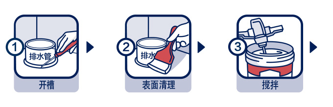基層處理: 基層應堅實、干凈、無油污、無灰渣,管道根部應無污物、灰渣或銹跡。堵漏施工前應先將漏水點或漏水縫鑿成寬度與深度均為1~2厘米左右的凹槽或燕尾槽,并清理干凈槽內(nèi)松散的碎渣。